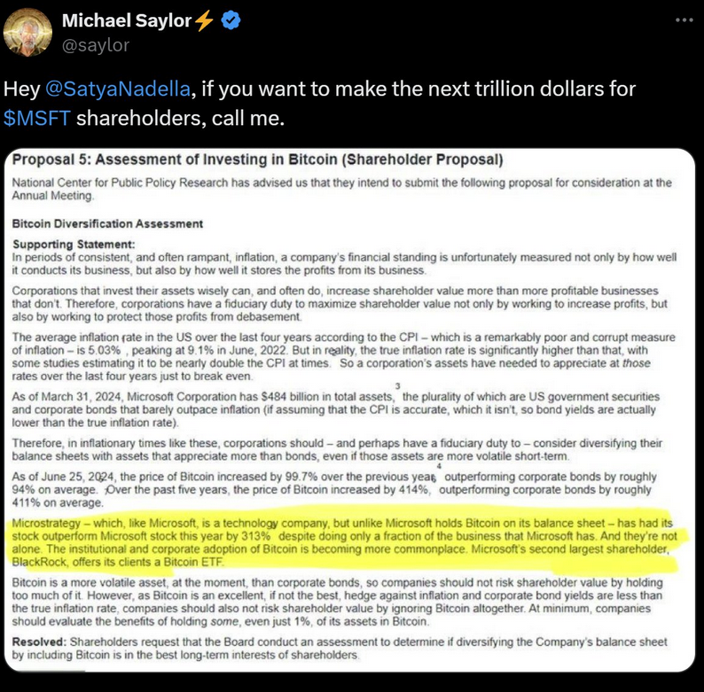 Bitcoin, the obscure magic internet money that started among a group of “cypherpunks” and a mailing list, seems to be going mainstream. This past week, Microsoft unveiled plans to include a proposal for assessing investment in Bitcoin at its upcoming shareholder meeting on December 10, 2024.